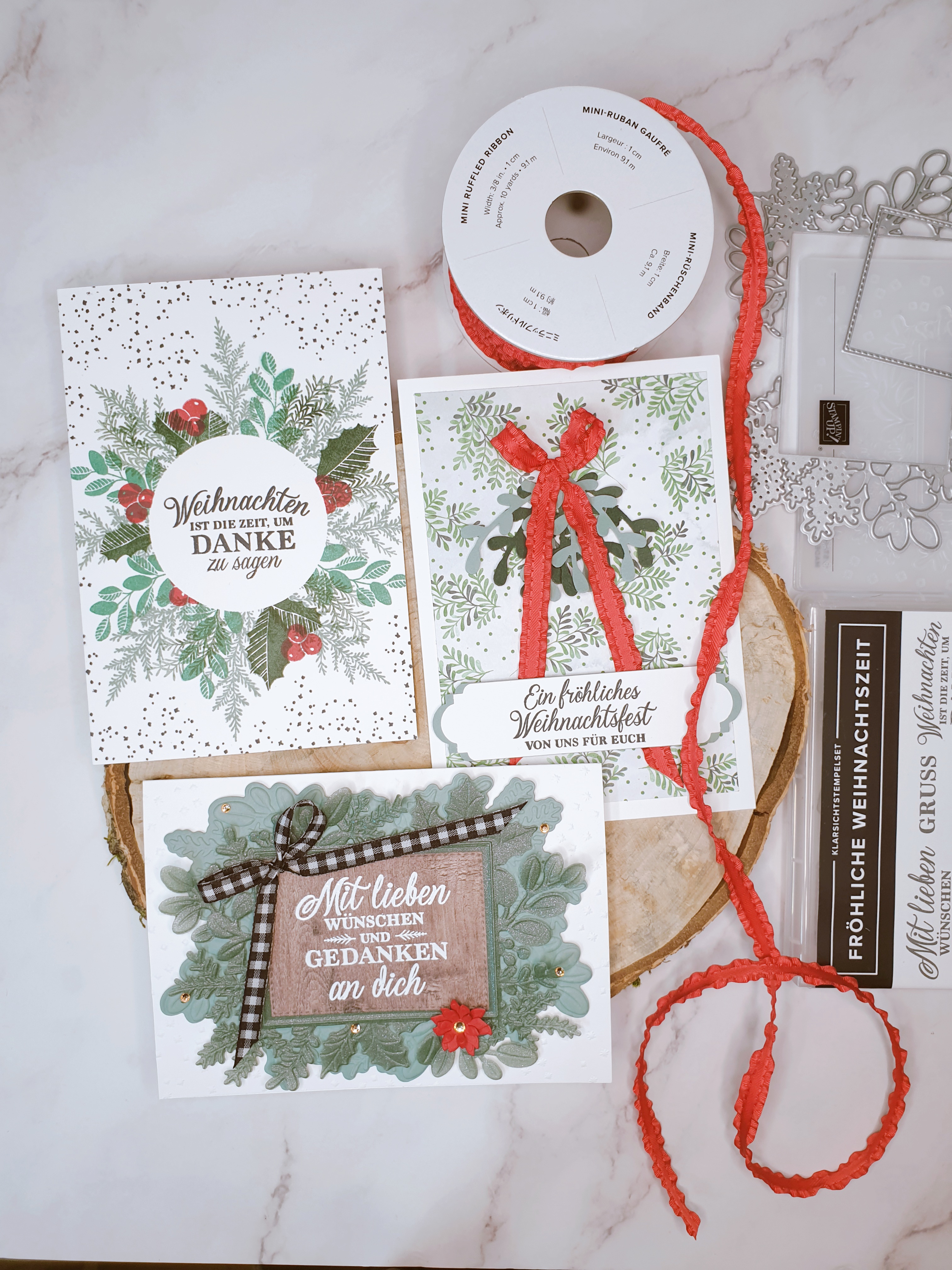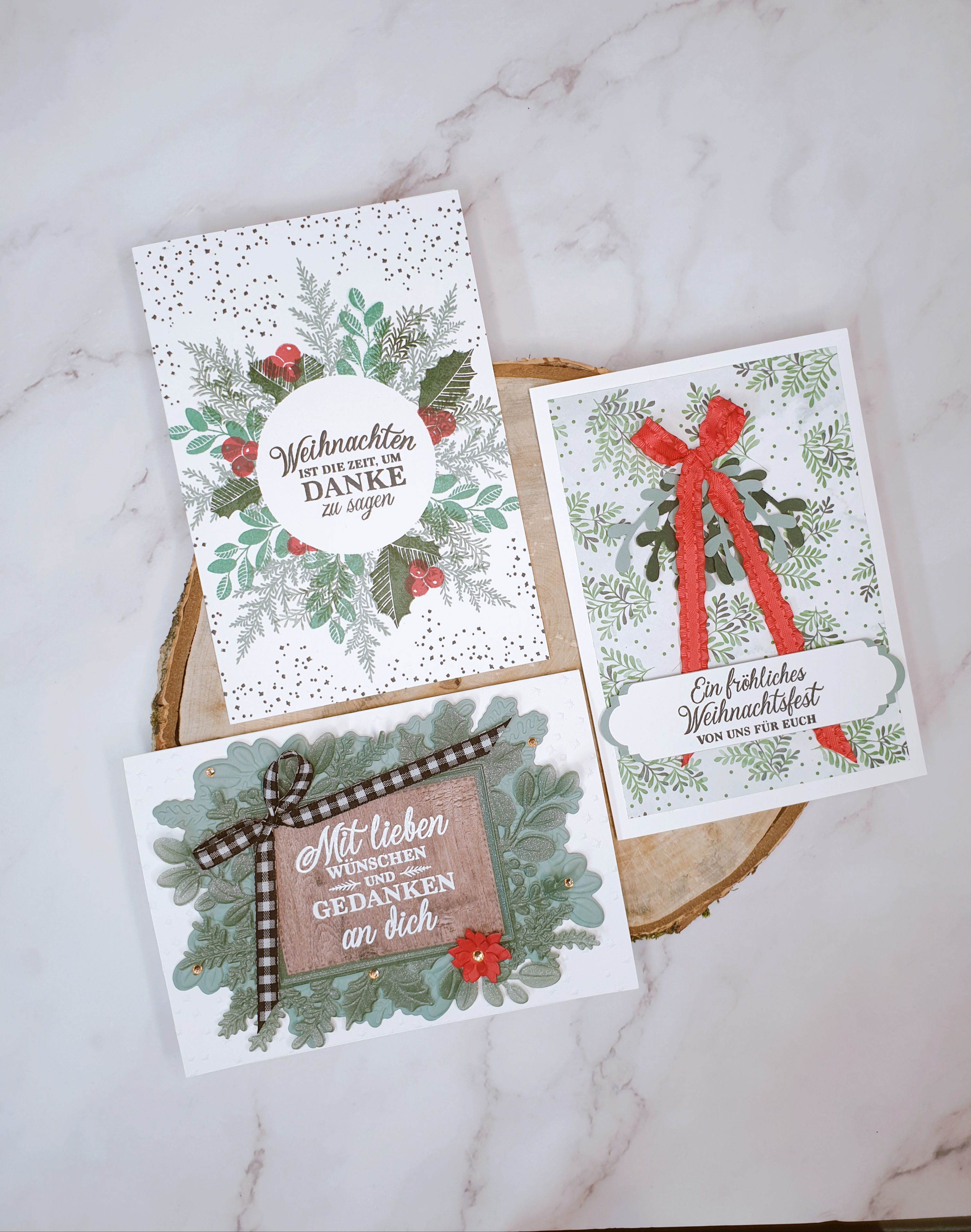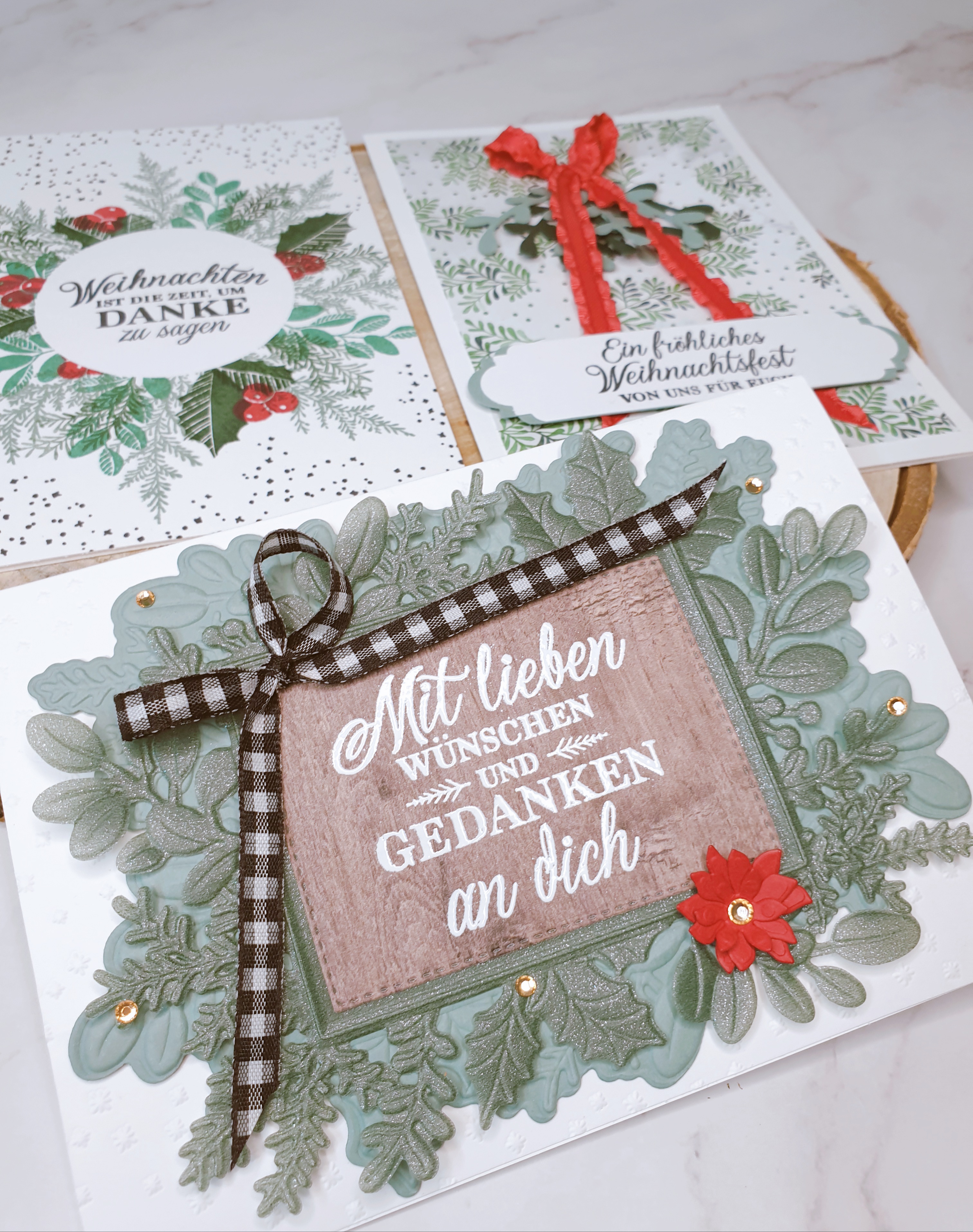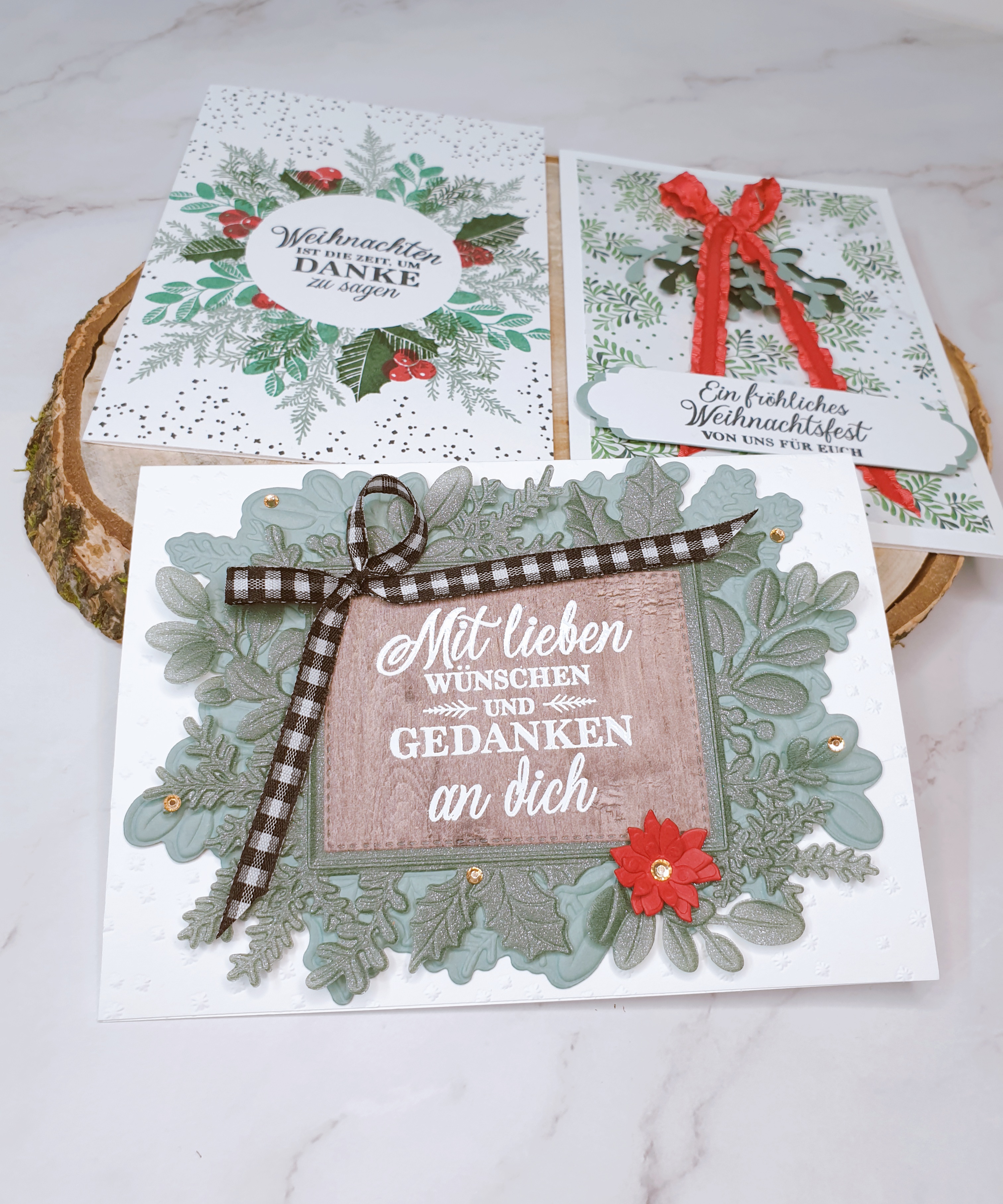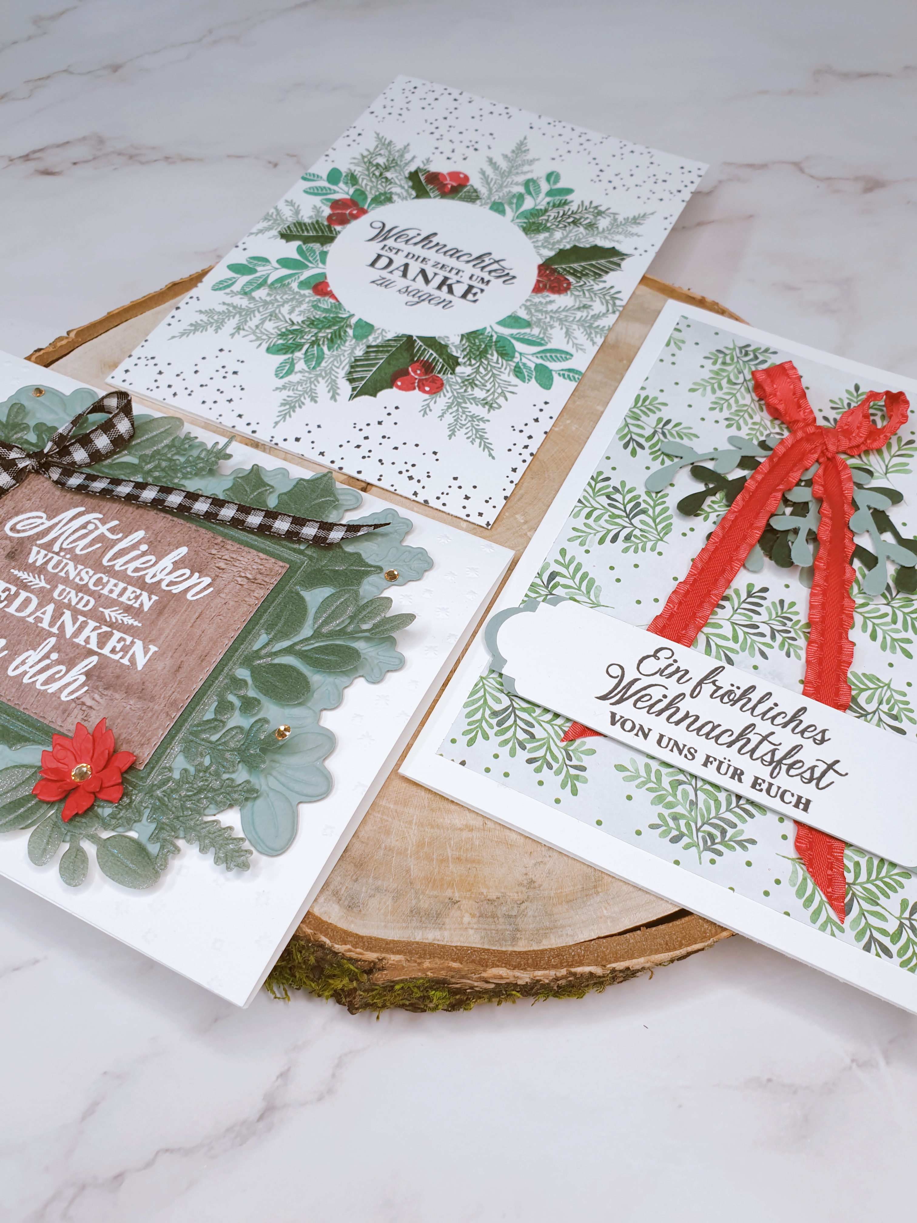 Da hast du sie also – 3 schöne Weihnachtskarten, von denen jede ein bisschen mehr ist als die andere. Ich mag diese Art zu arbeiten, sie bringt deine Kreativität in Schwung und am Ende hast du mehrere Karten, die du vorzeigen kannst – das ist immer eine gute Sache!