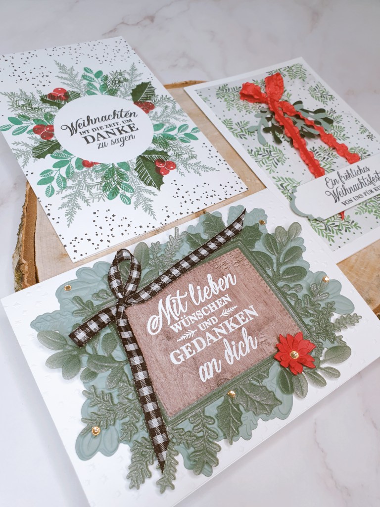 Und das sind die 3, auf die ich gekommen bin. Ich habe mich für das Thema Weihnachten entschieden, da ich noch nicht viel damit gemacht habe, und ich liebe dieses Stempelset, die passenden Stanzen und den 3D-Prägefolder – alles von Stampin‘ Up!