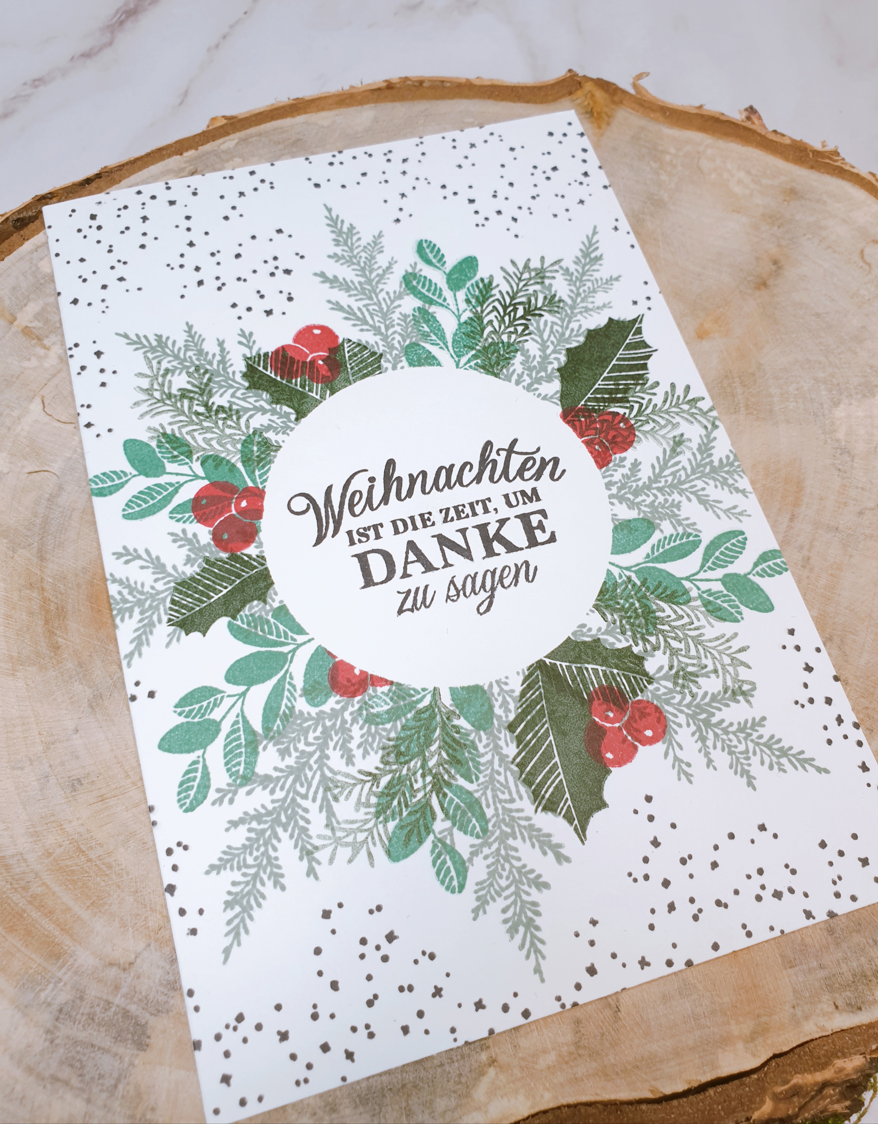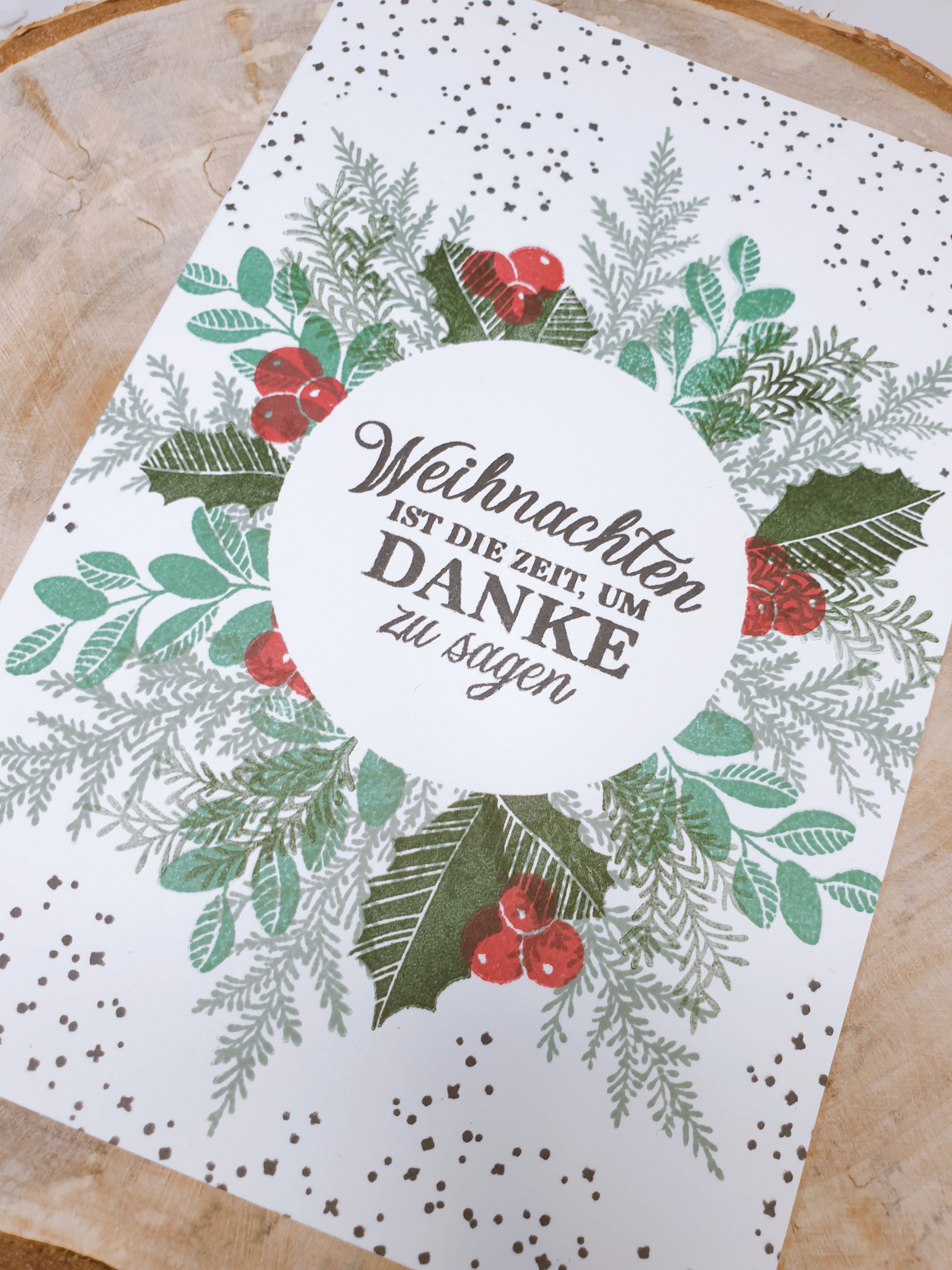 Für die Anfängerin habe ich einen Kranz gestempelt – das geht ganz einfach, indem du einen Kreis aus Kopierpapier stanzt, ihn auf der Karte befestigst und dann dein Laub in einem Kreis stempelst. Wenn du den Papierkreis entfernst, bleibt eine freie Fläche übrig, auf die du deinen Gruß stempeln kannst.