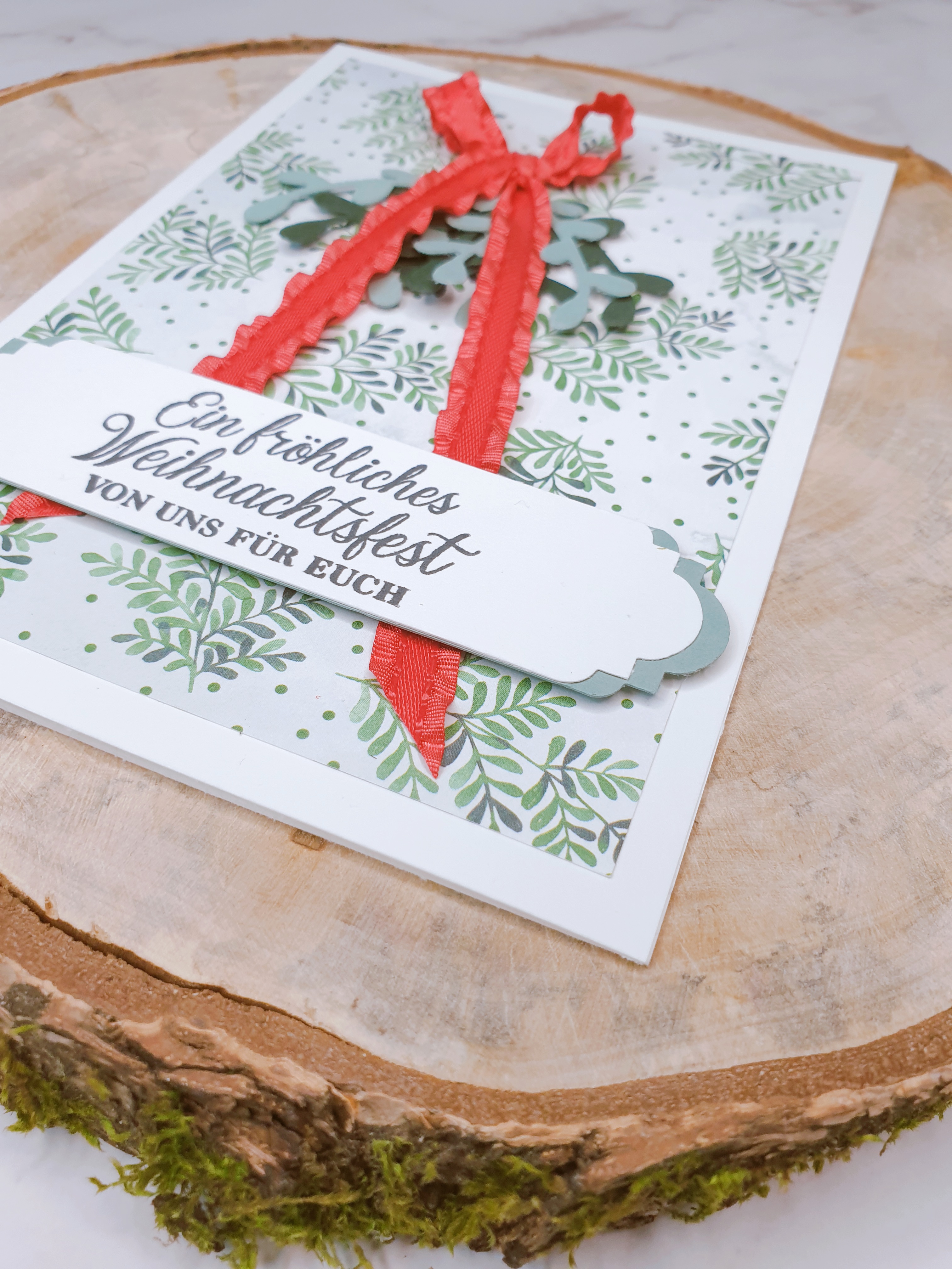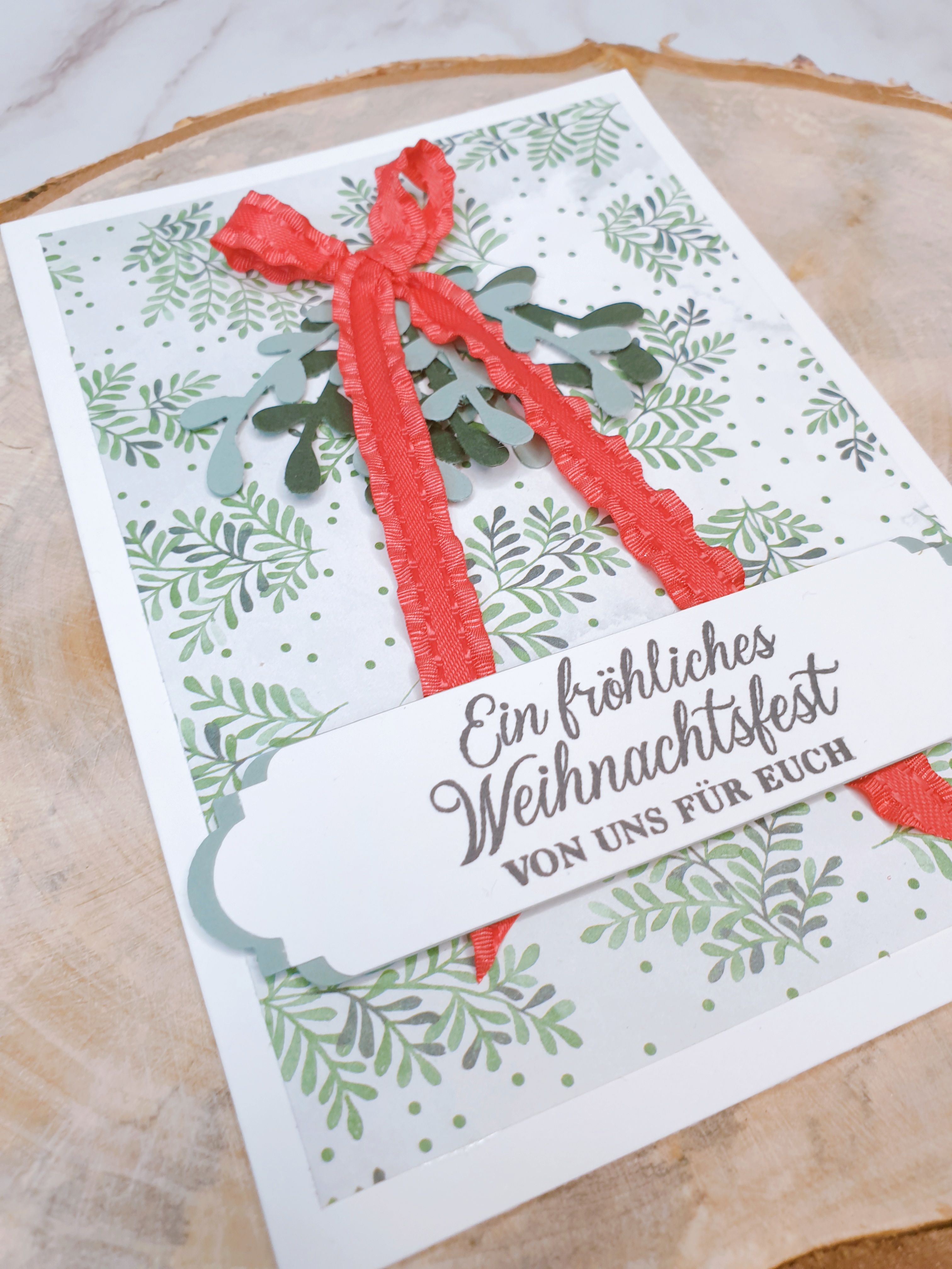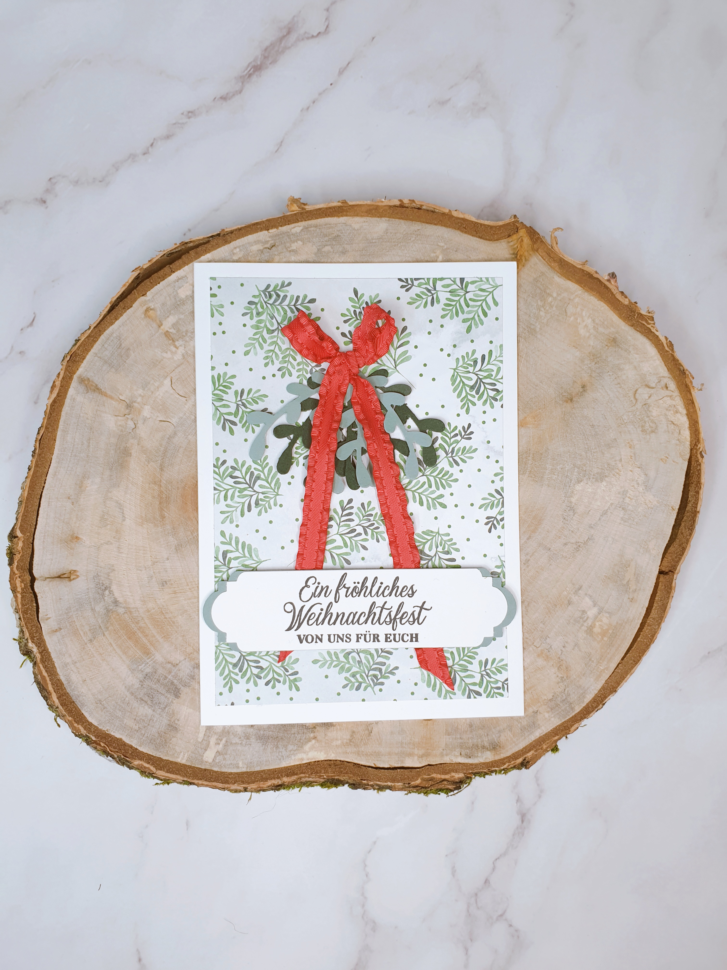 Für den Gelegenheitsbastler habe ich einen Mistelzweig mit einem schönen roten Band zusammengebunden. Ich liebe Misteln – ob echt oder aus Papier. Dann habe ich mit einer Stanze 2 verschieden große Etiketten aus verschiedenfarbigem Cardstock gestanzt, sie zusammengeklebt und meinen Gruß gestempelt. Natürlich dürfen wir unsere Stampin‘ Up! Dimensionals nicht vergessen, die deinen Projekten das gewisse Etwas verleihen.