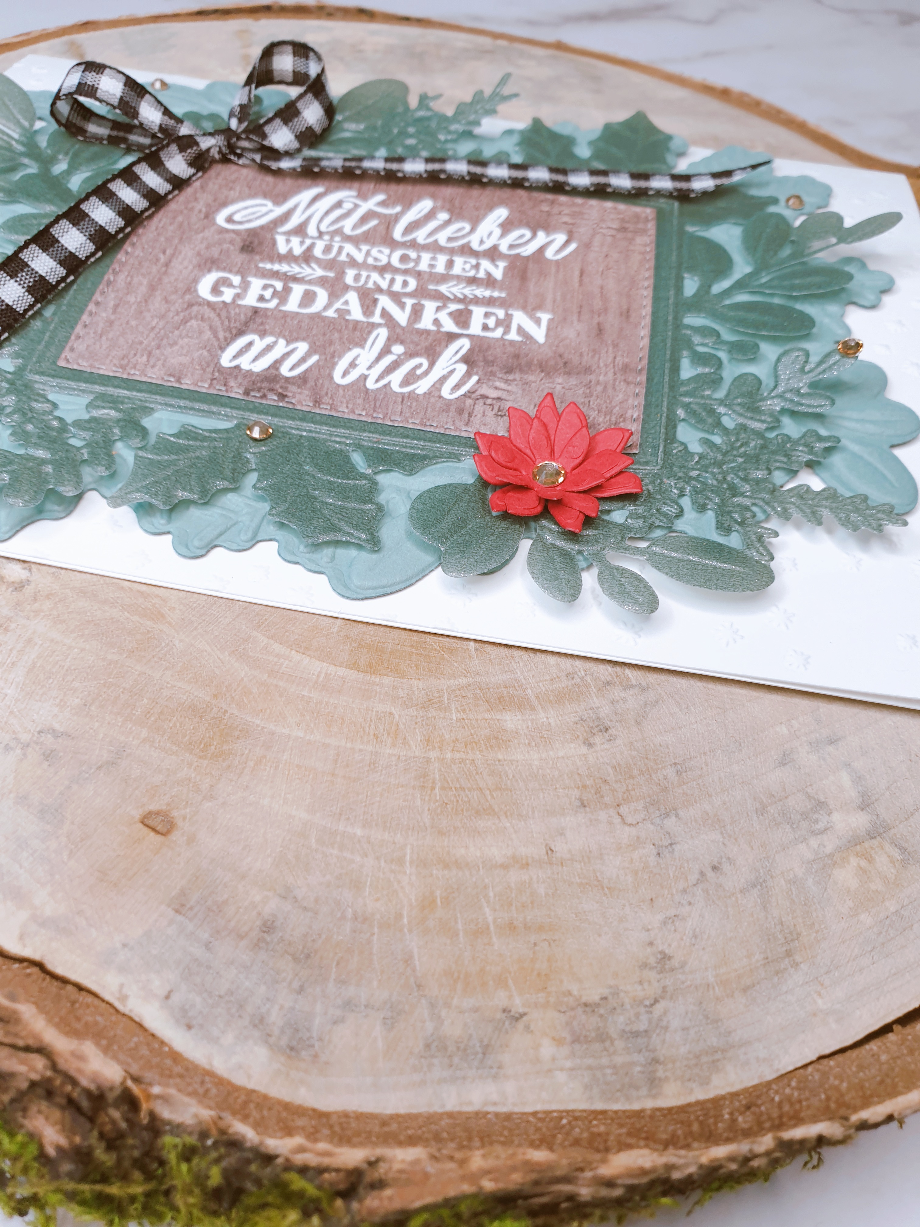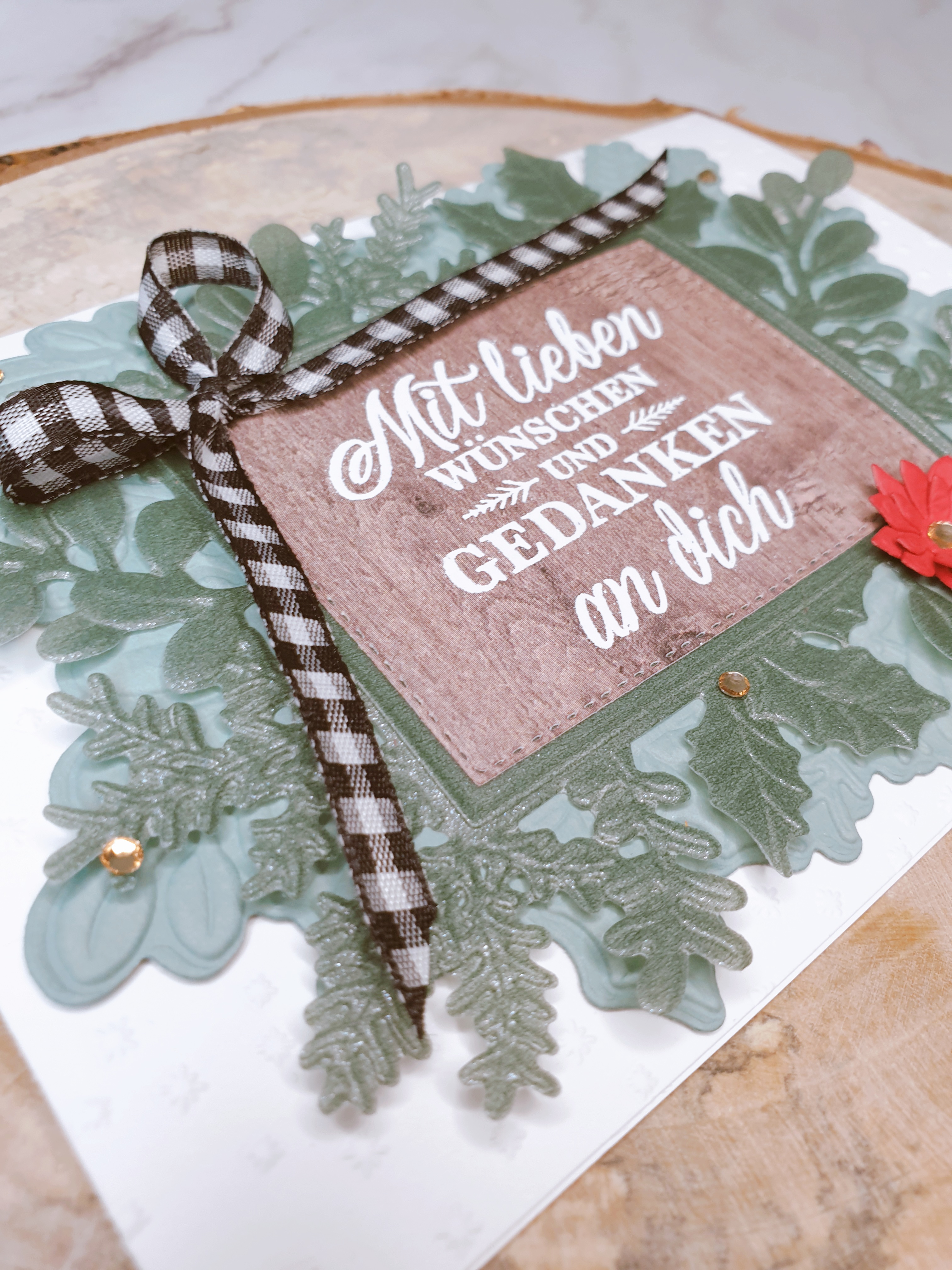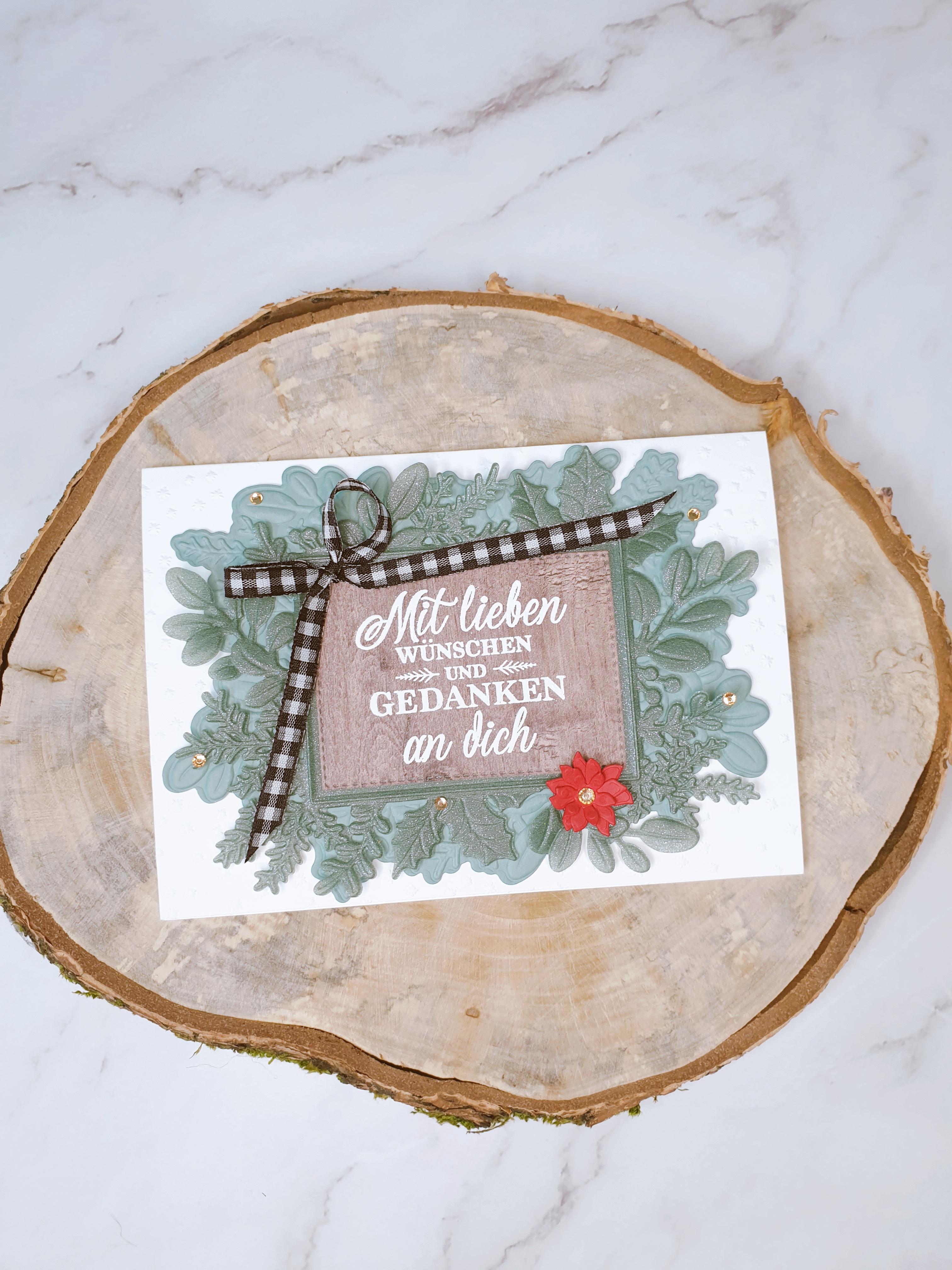 Für die Mitte habe ich etwas Holzmaserungspapier verwendet und dann meinen Gruß mit Heiß-embossing aufgetragen. Er brauchte etwas Rotes, also habe ich diese niedlichen Weihnachtsstern-Stanzformen verwendet und ihm mit einem champagnerfarbenen Strassstein ein bisschen Glitzer verpasst, und dann habe ich noch ein paar mehr darüber gestreut, denn ich liebe funkelnde Weihnachten, du nicht auch?