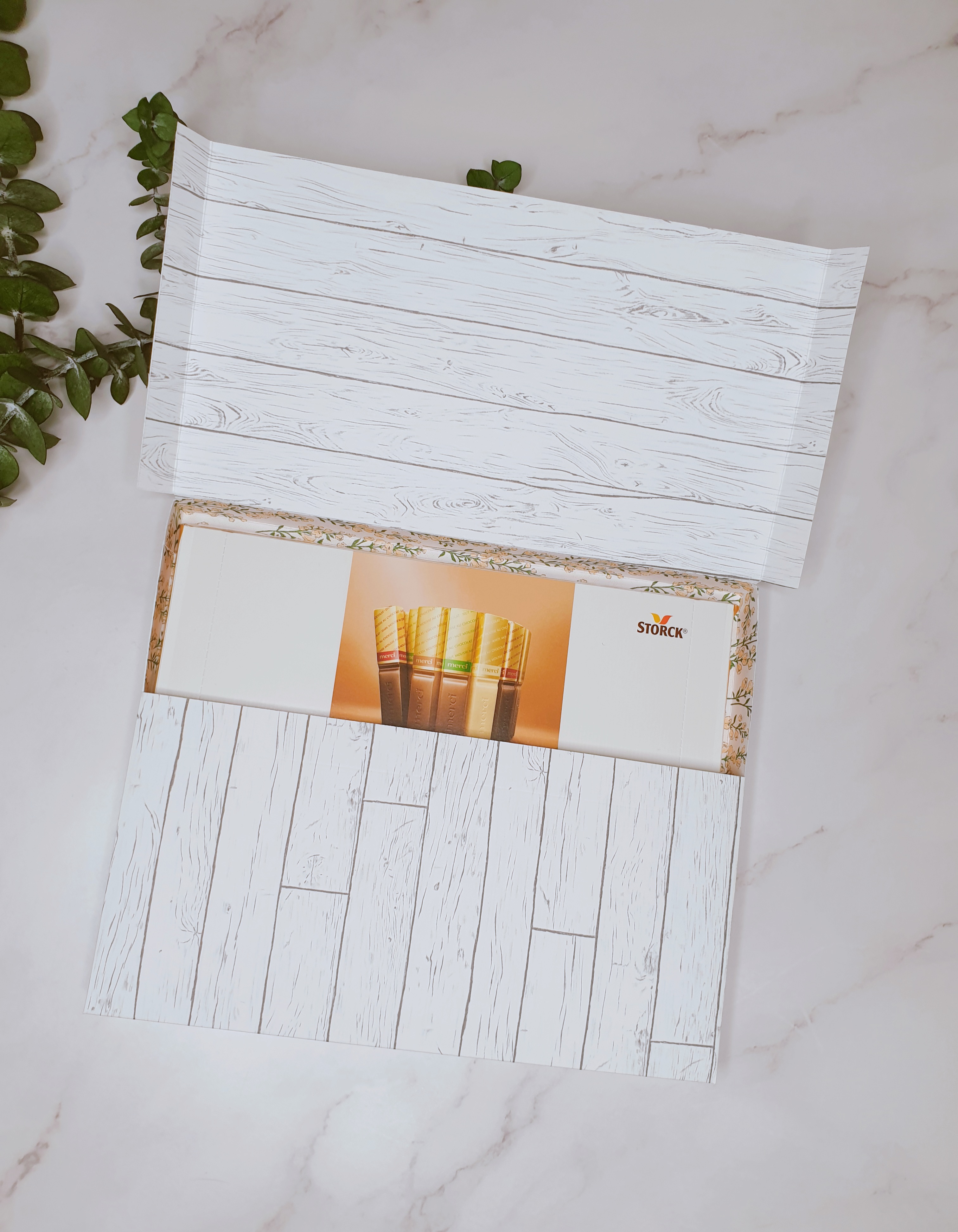 Die erste ist, wie gesagt, für eine Schachtel Merci-Pralinen – wie du sehen kannst, passt die Schachtel perfekt. Da ich mich darauf freue, dass der Winter vorbei ist, habe ich ihr einen Hauch von Frühling verliehen. Ich habe Papier aus dem LAND & LIEBE DSP verwendet. Es gefällt mir sehr gut, denn die B-Seite besteht aus Holzmaserungen in weißer Farbe – wirklich schön.