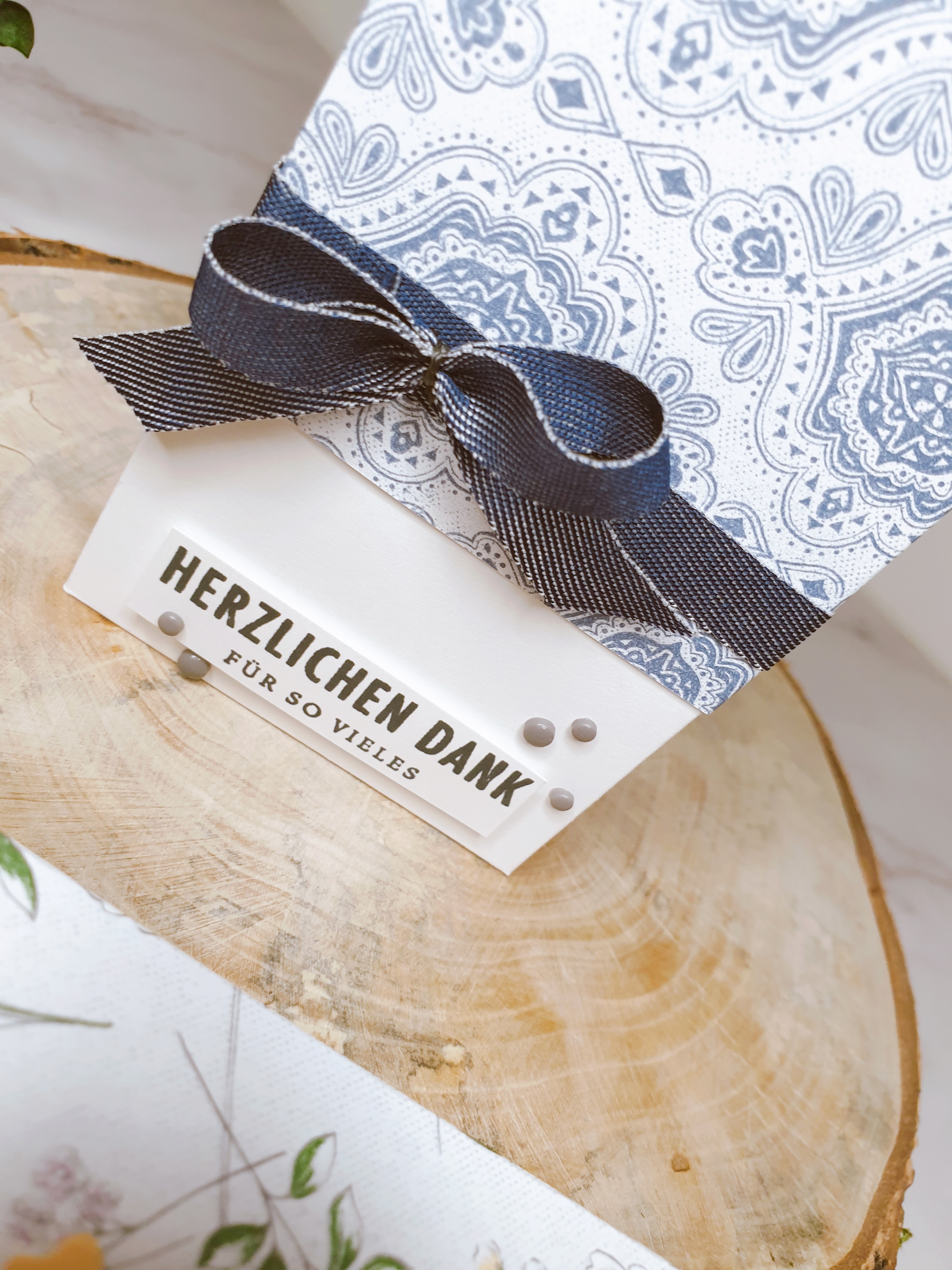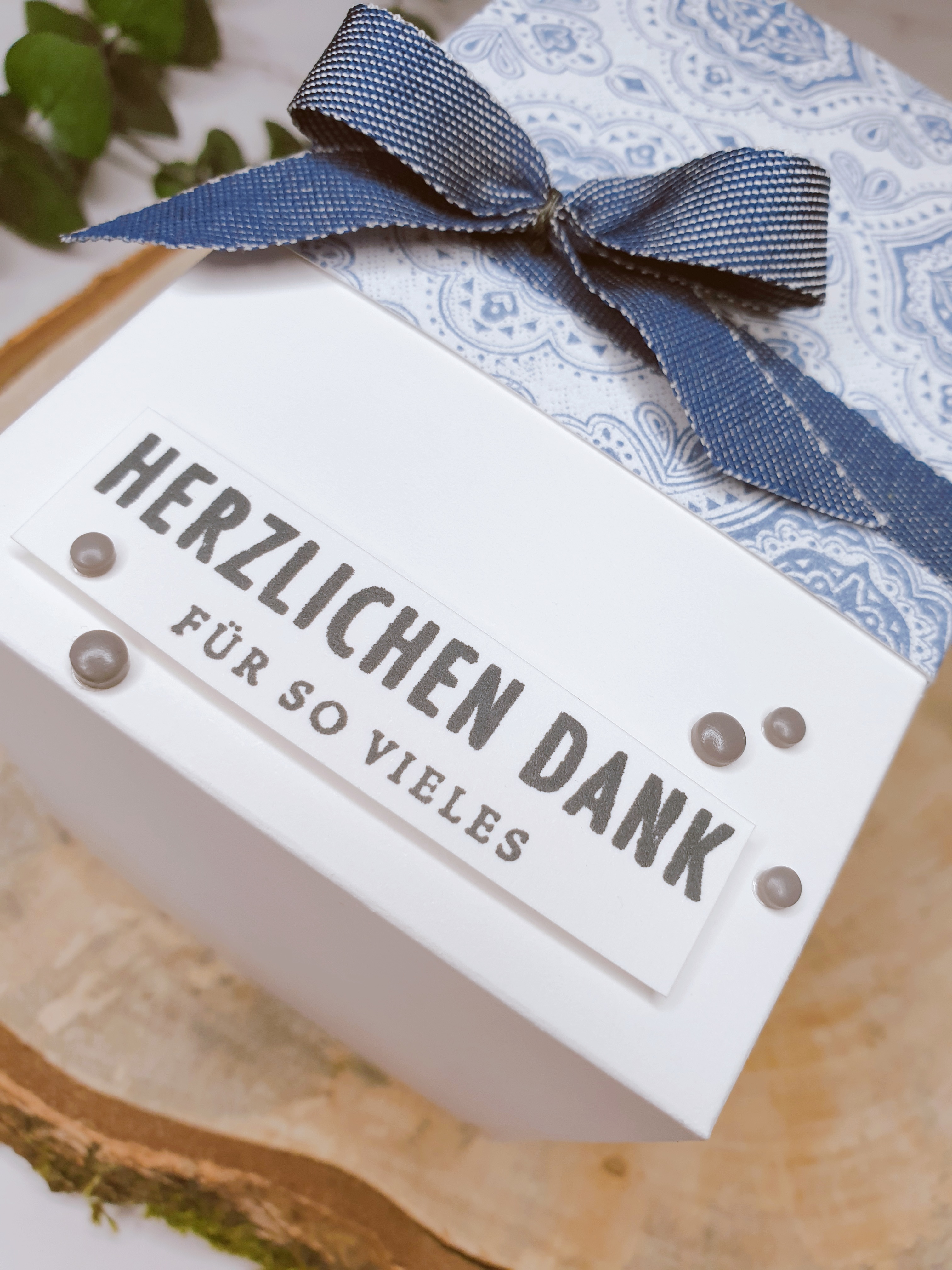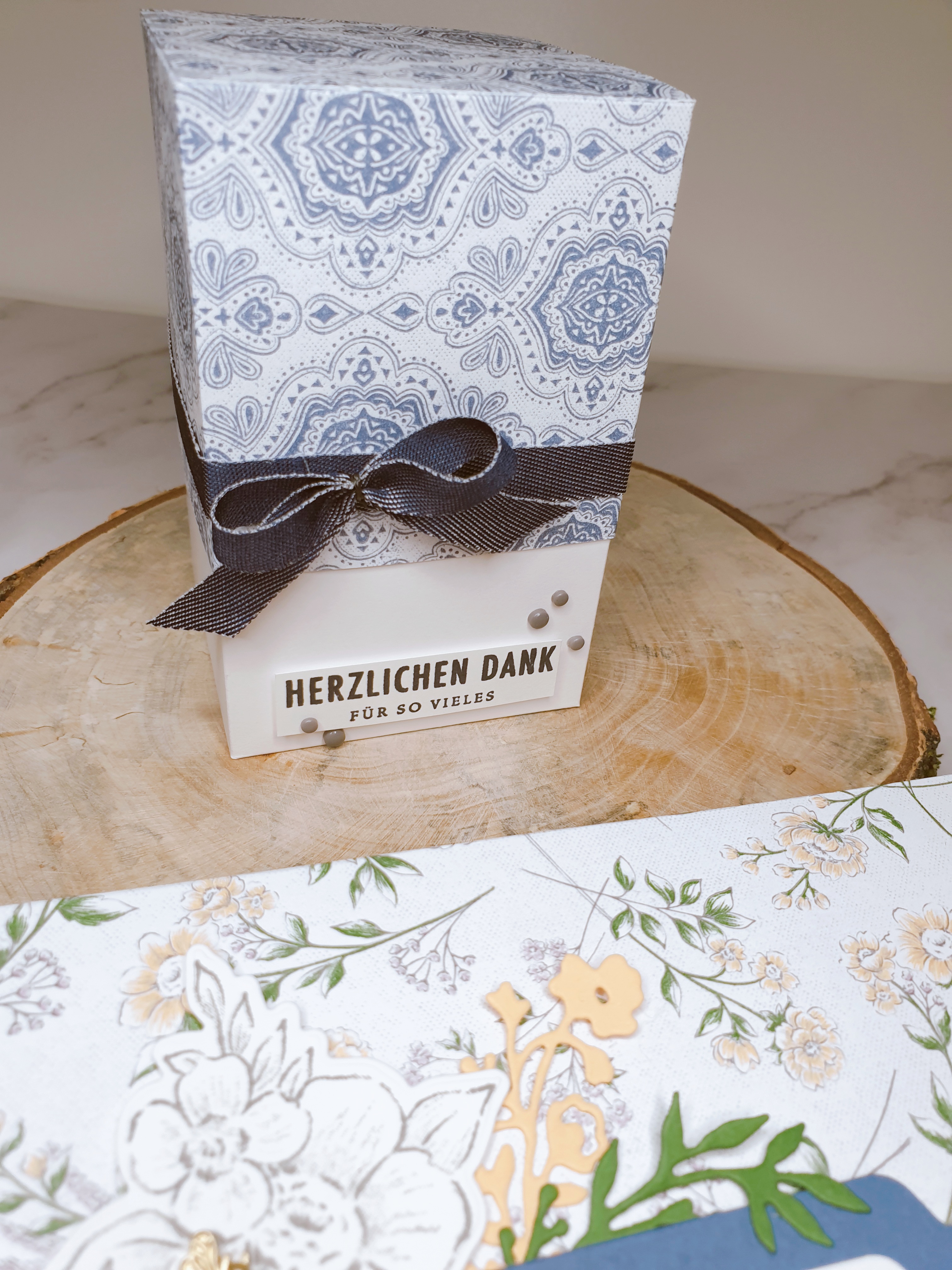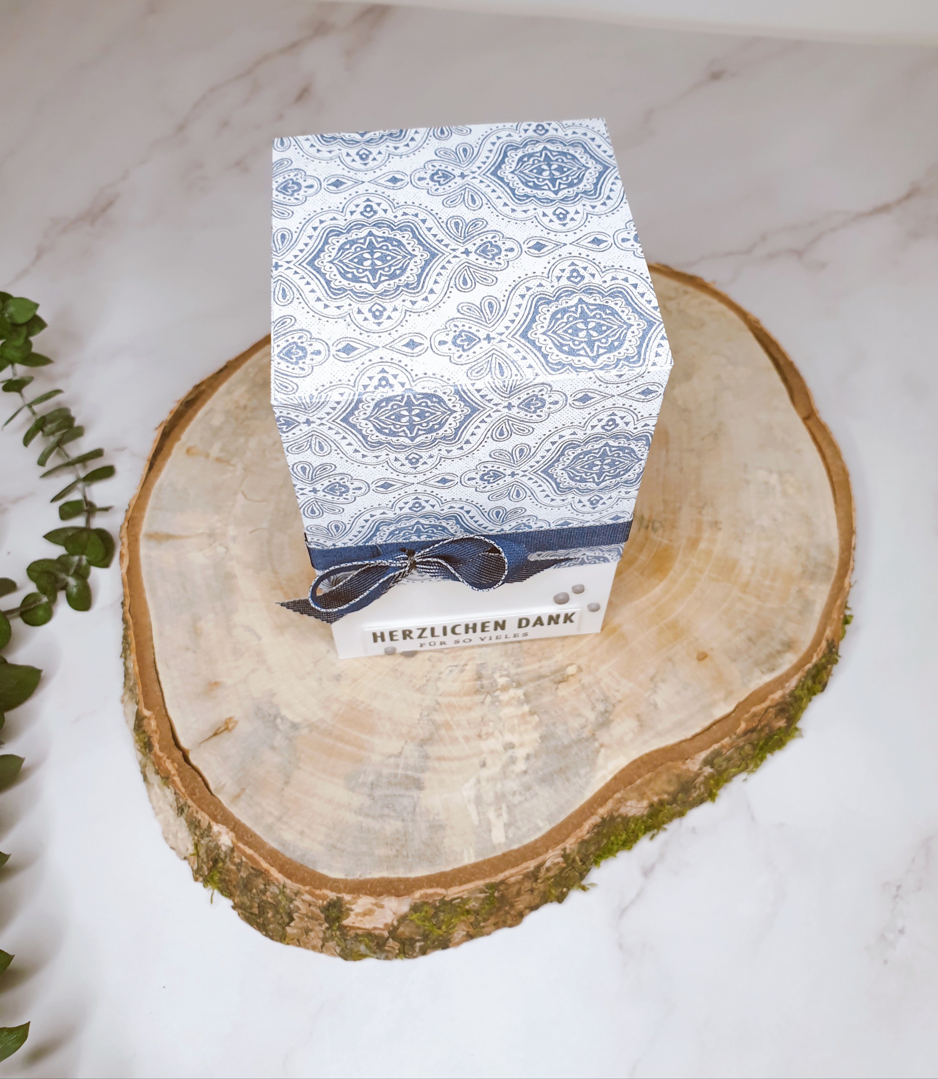 Für diese Schachtel habe ich auch das DSP LAND & LIEBE verwendet – ich glaube, das ist mein Lieblingsmuster aus dem ganzen Paket, ich liebe Blau und Weiß zusammen. Der Text stammt aus dem Stempelset LANDSEGEN. Den Deckel habe ich mit dem tollen JEANSBAND rundherum und einer süßen Schleife verziert. Und dann noch etwas KLASSISCHE RUNDE AKZENTE IN MATTER OPTIK, um den ganzen Look abzurunden.