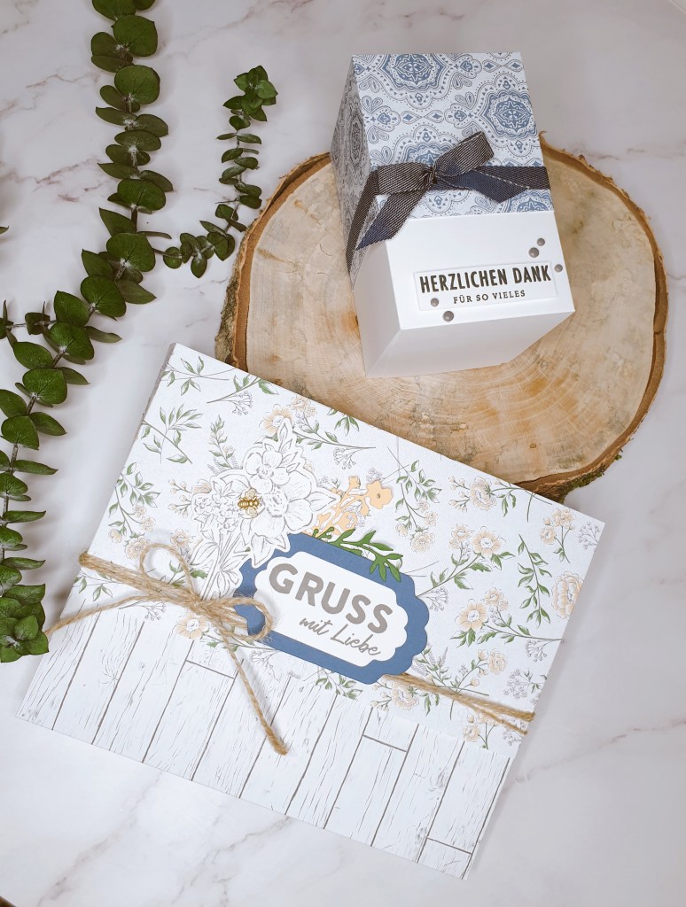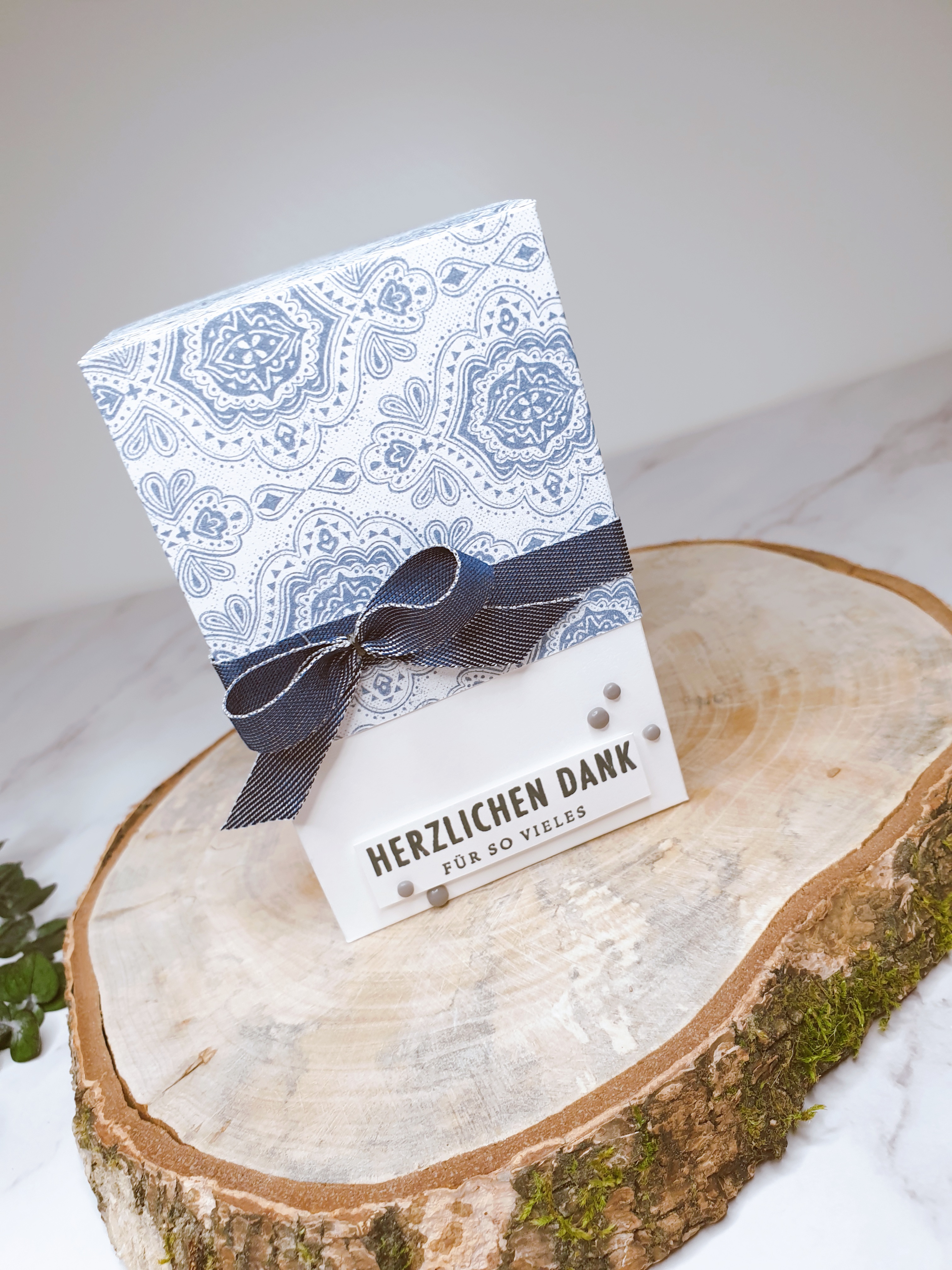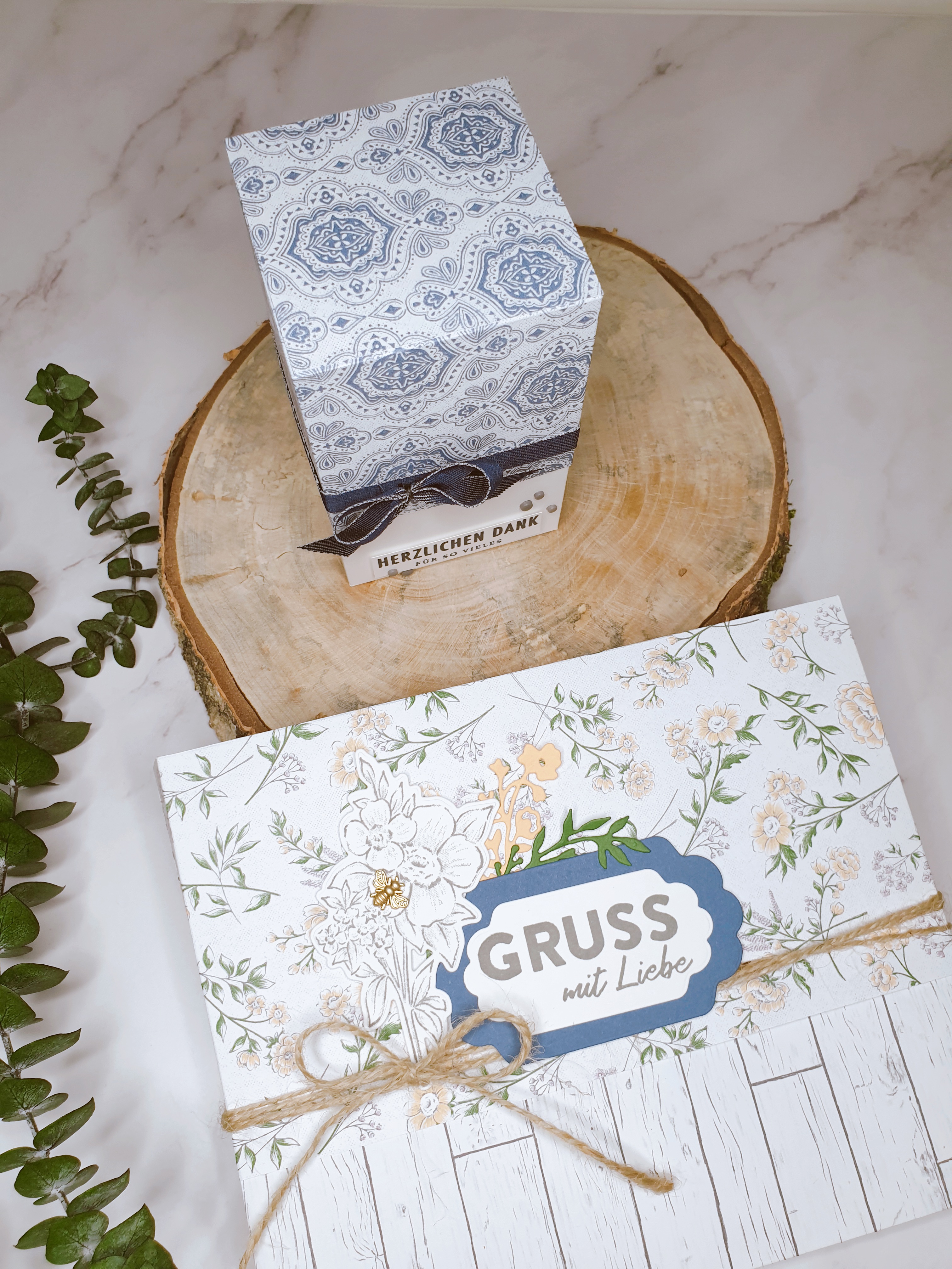 Für diese Schachtel habe ich auch das DSP LAND & LIEBE verwendet – ich glaube, das ist mein Lieblingsmuster aus dem ganzen Paket, ich liebe Blau und Weiß zusammen. Der Text stammt aus dem Stempelset LANDSEGEN. Den Deckel habe ich mit dem tollen JEANSBAND rundherum und einer süßen Schleife verziert. Und dann noch etwas KLASSISCHE RUNDE AKZENTE IN MATTER OPTIK, um den ganzen Look abzurunden.