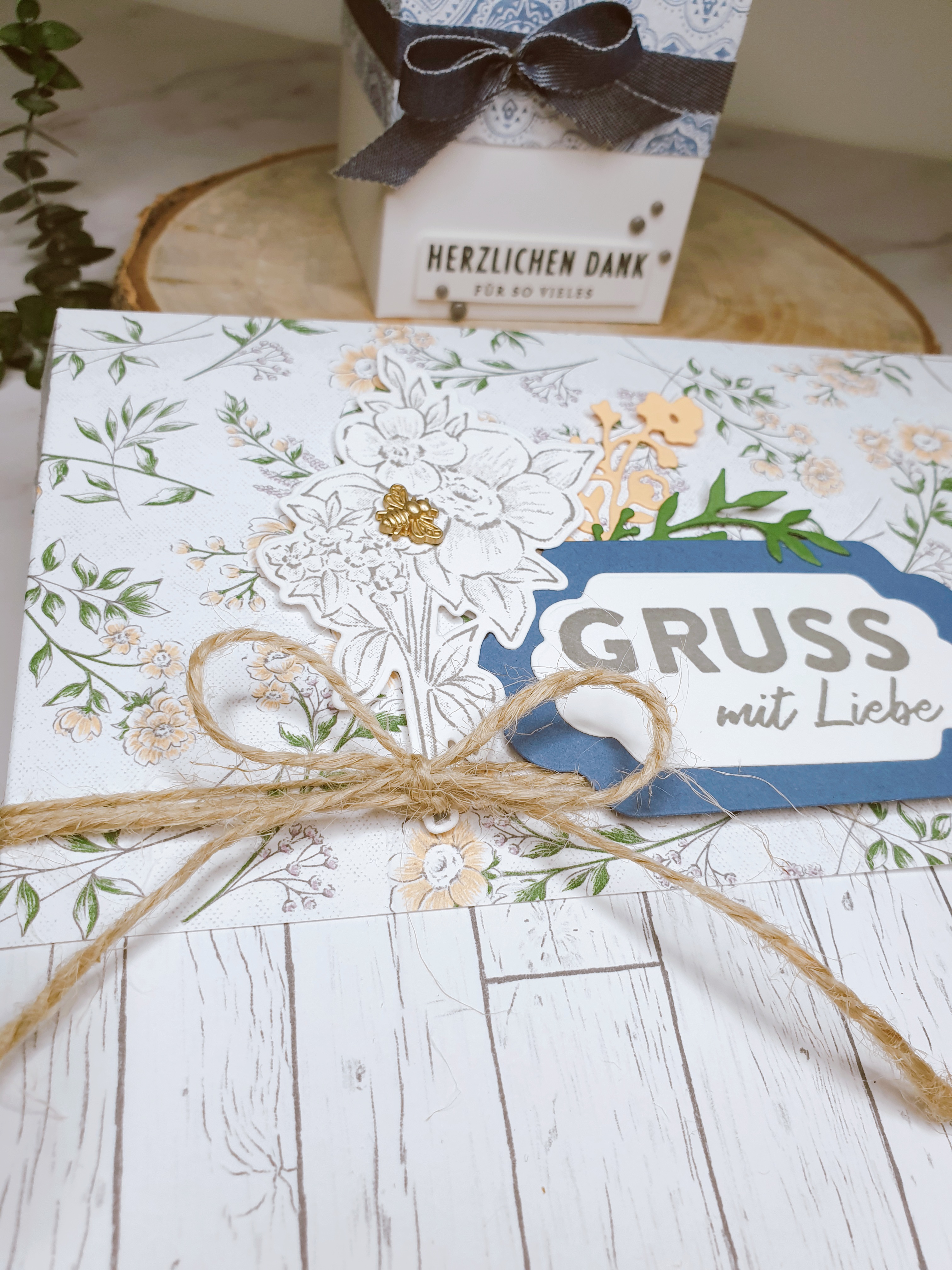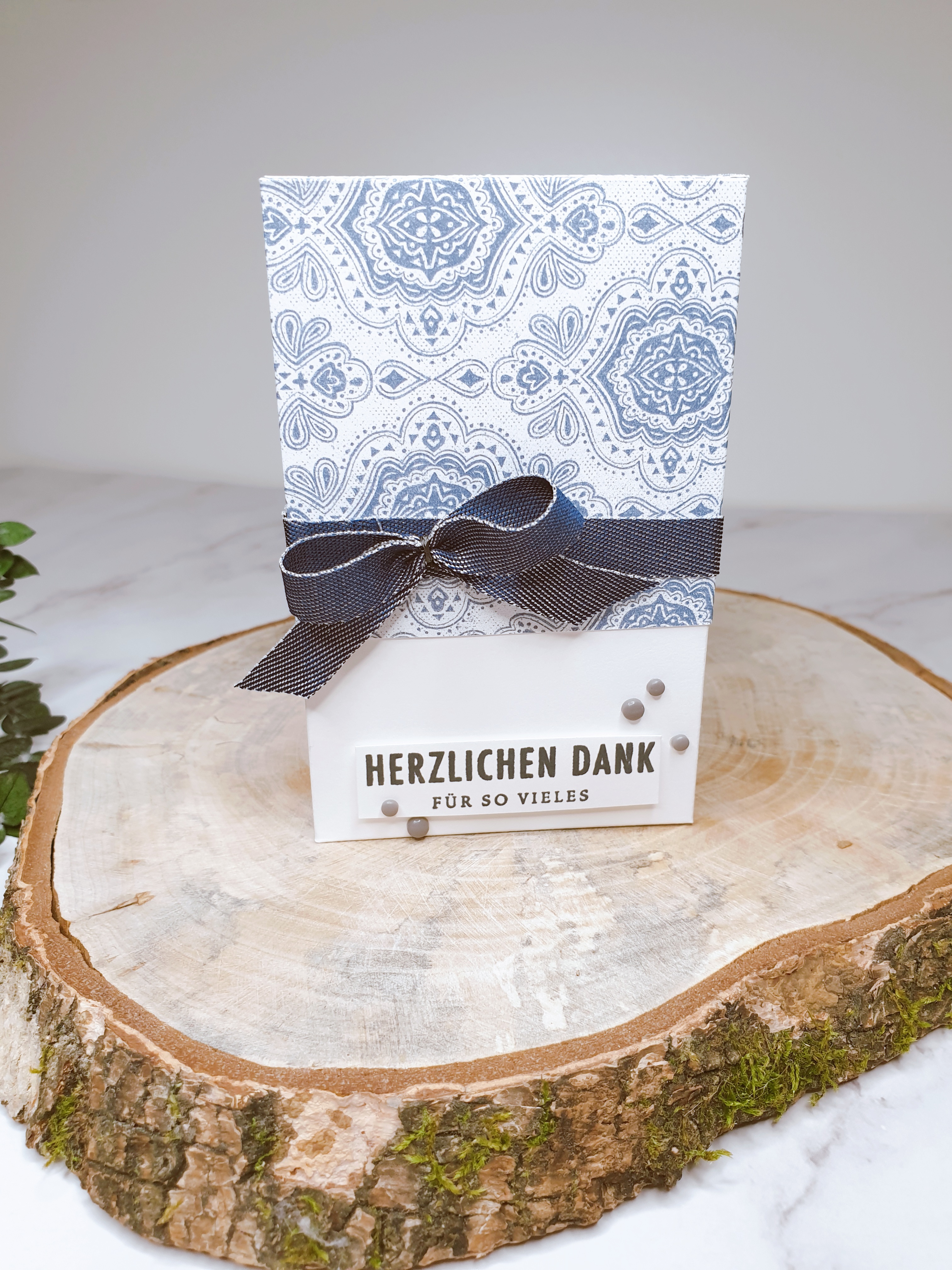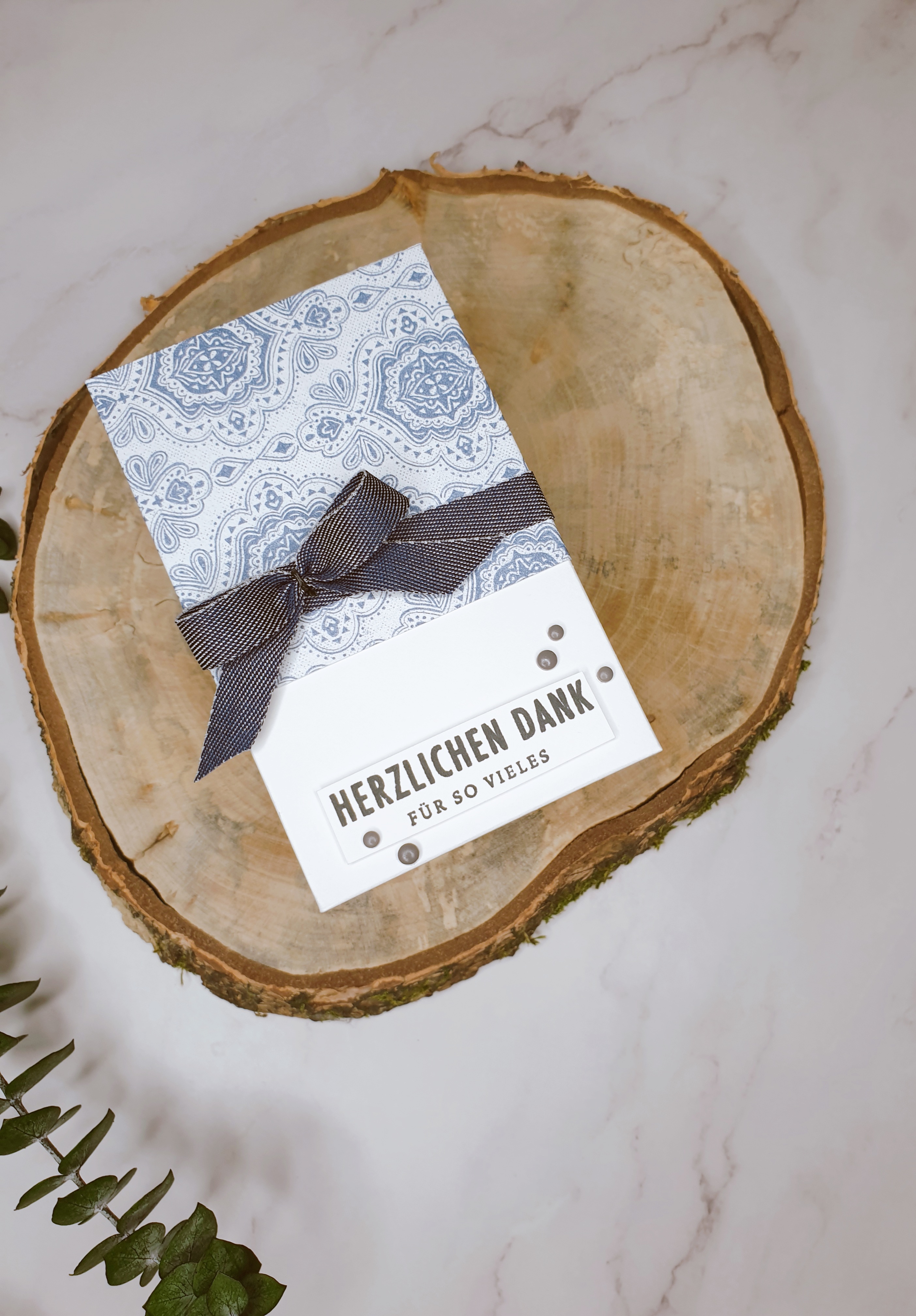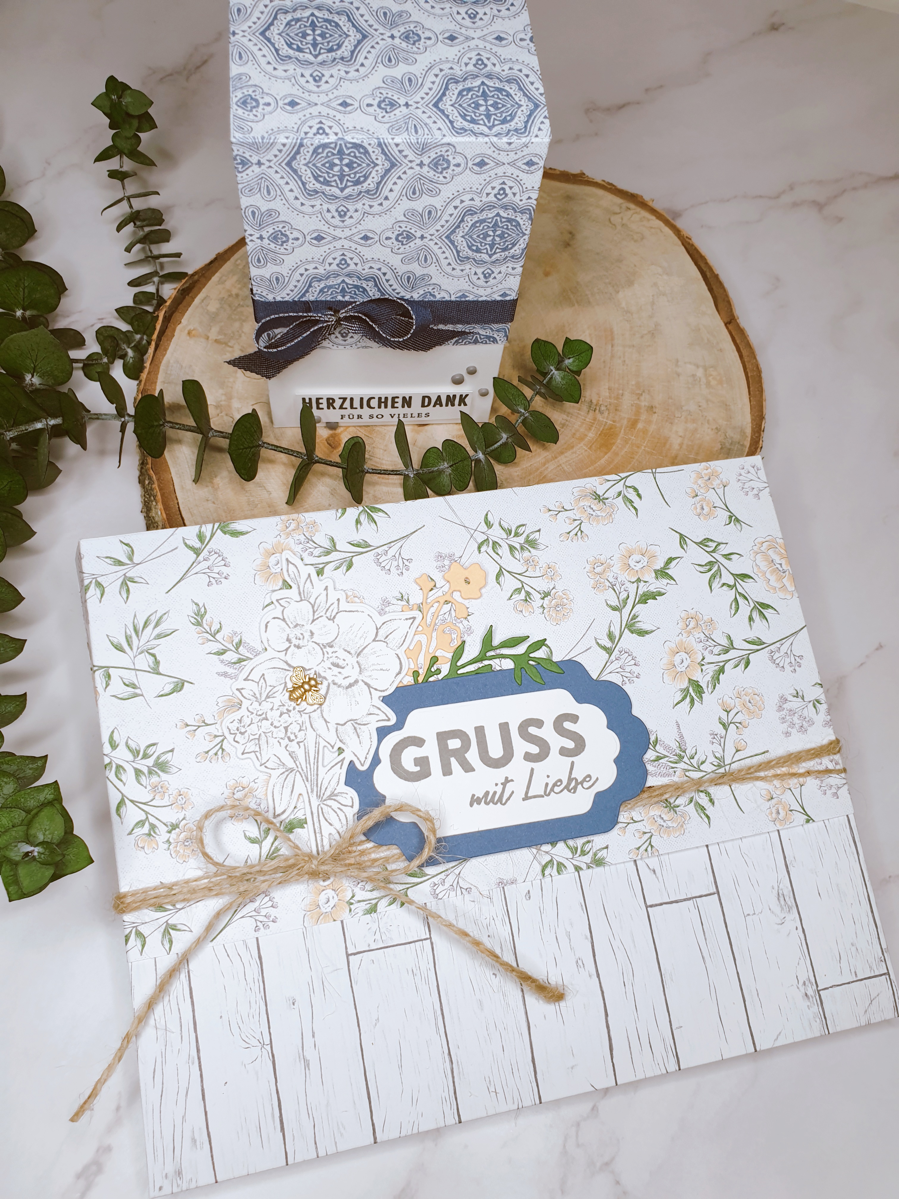 Für diese Schachtel habe ich auch das DSP LAND & LIEBE verwendet – ich glaube, das ist mein Lieblingsmuster aus dem ganzen Paket, ich liebe Blau und Weiß zusammen. Der Text stammt aus dem Stempelset LANDSEGEN. Den Deckel habe ich mit dem tollen JEANSBAND rundherum und einer süßen Schleife verziert. Und dann noch etwas KLASSISCHE RUNDE AKZENTE IN MATTER OPTIK, um den ganzen Look abzurunden.