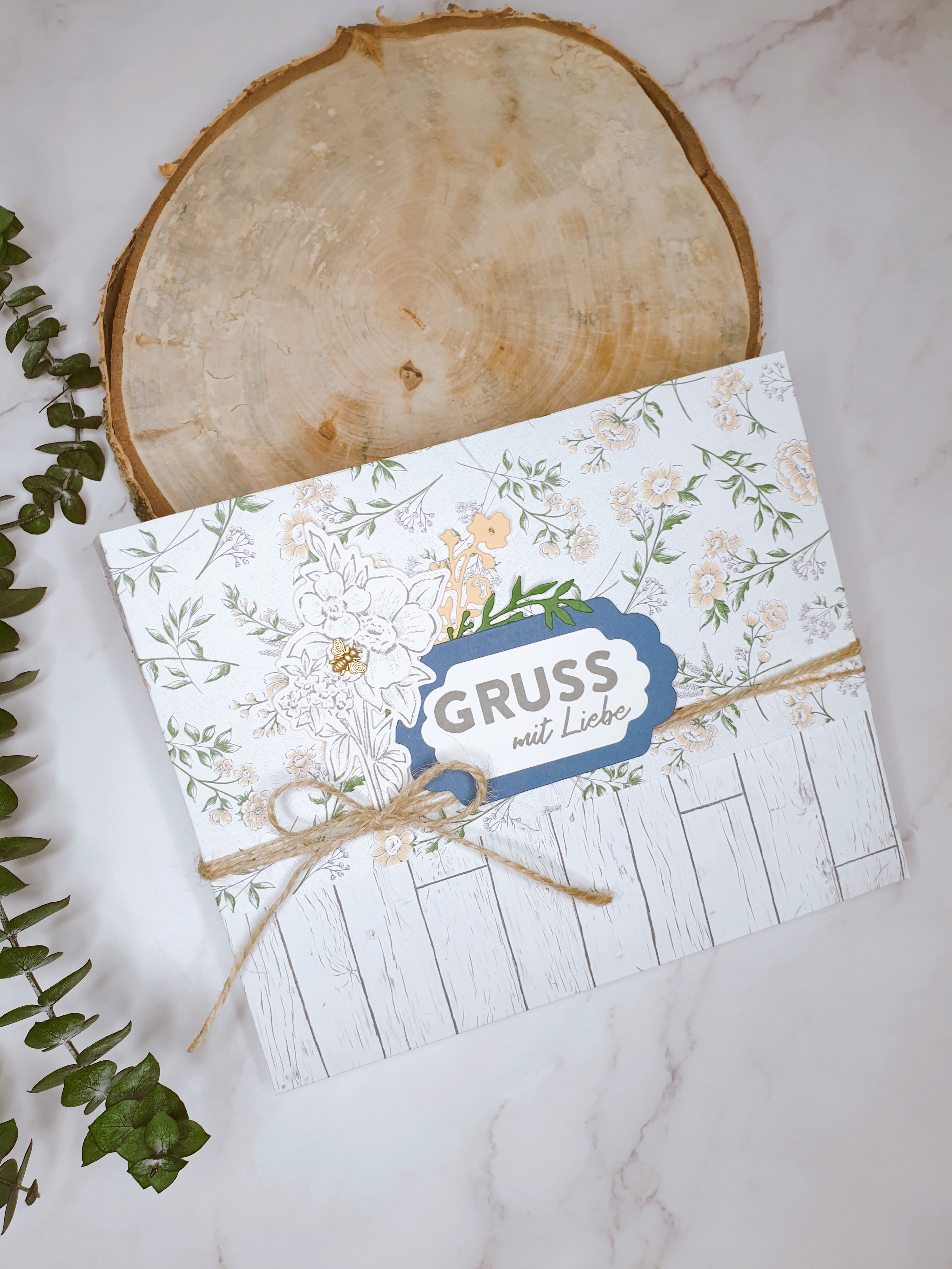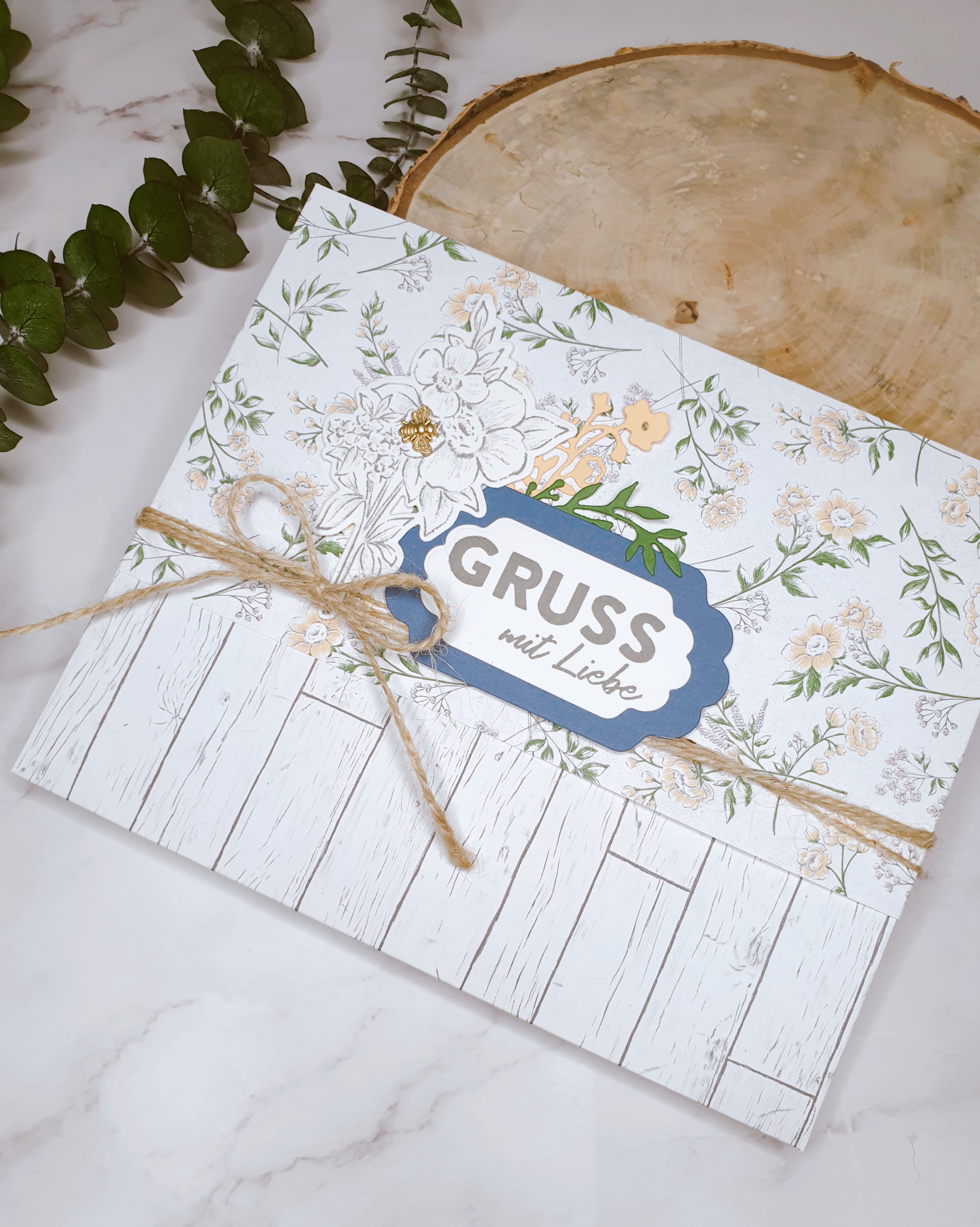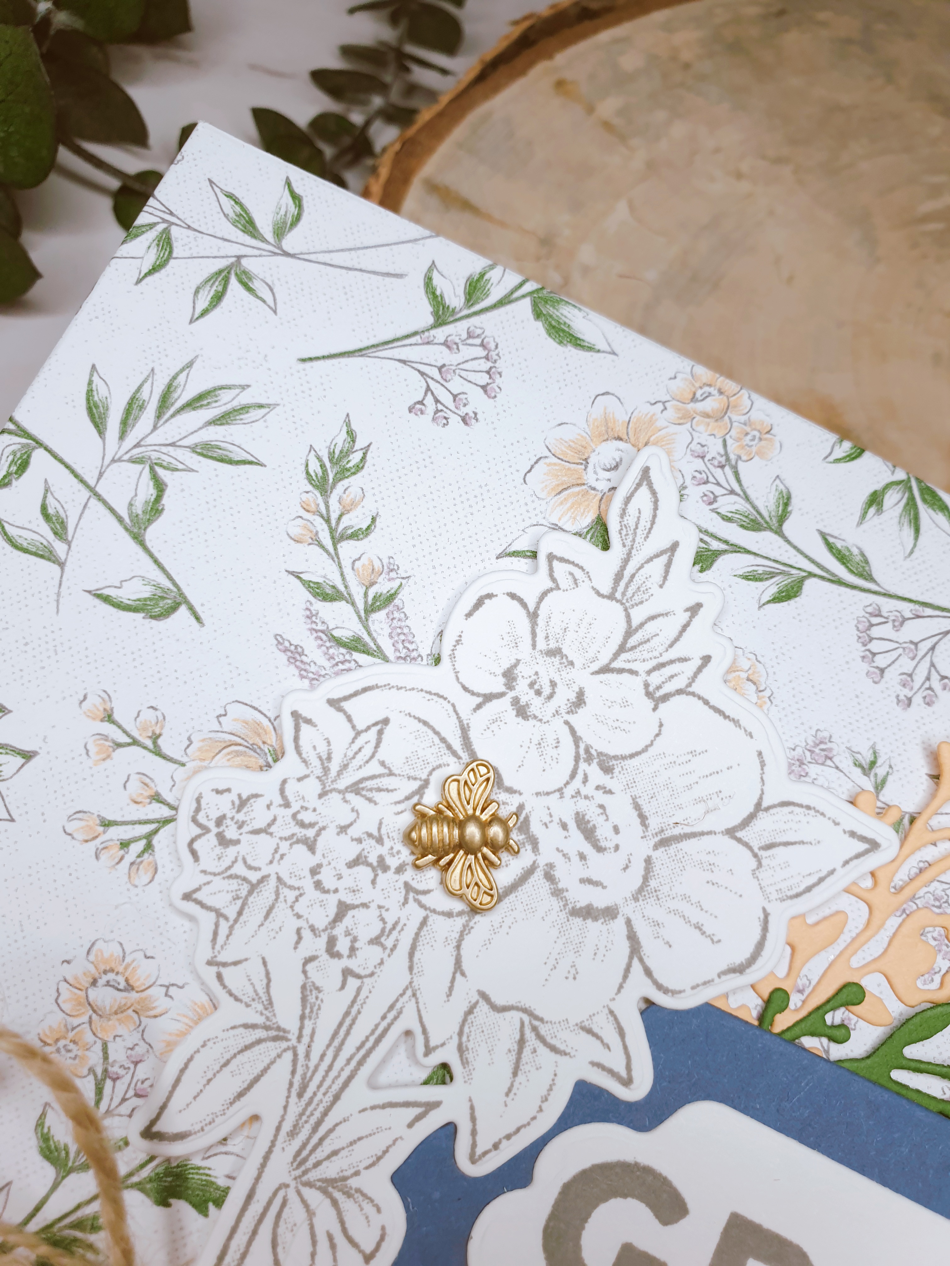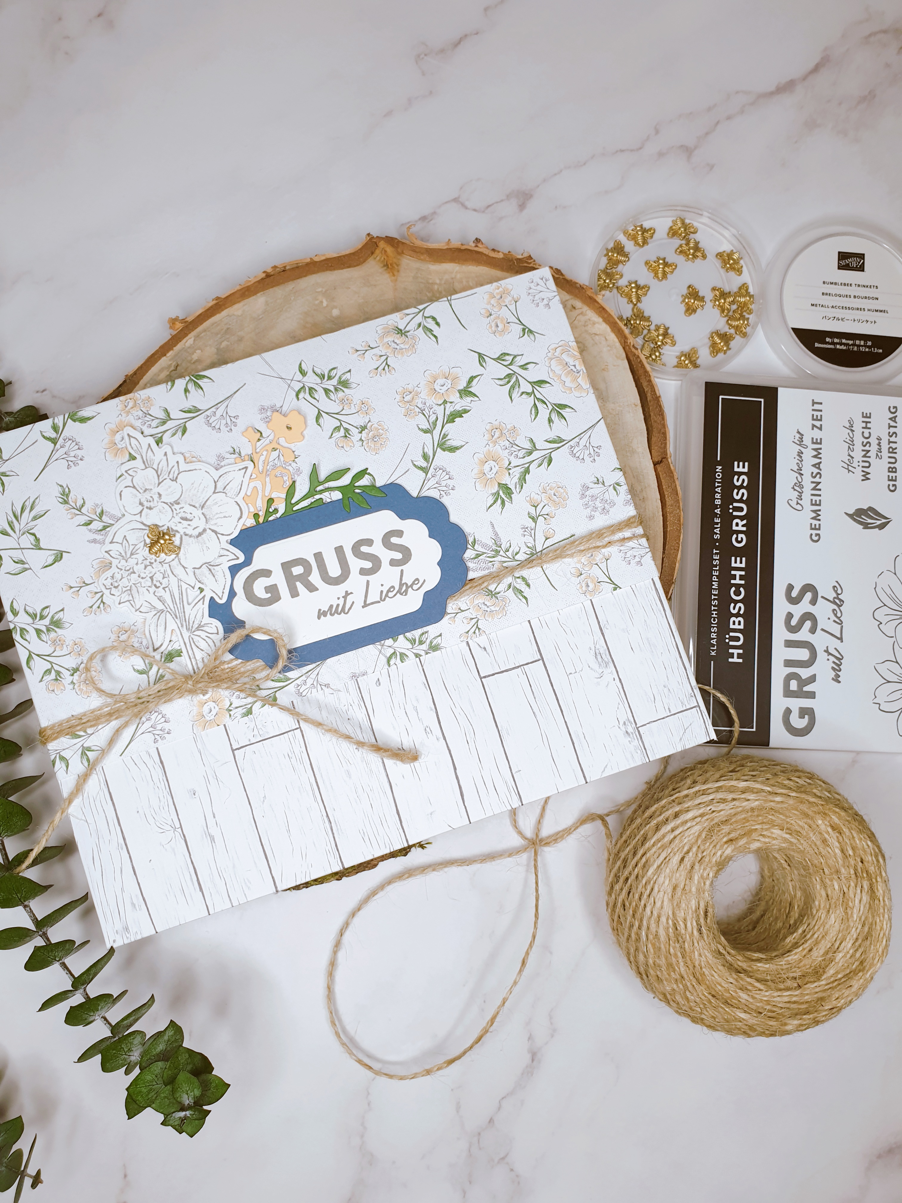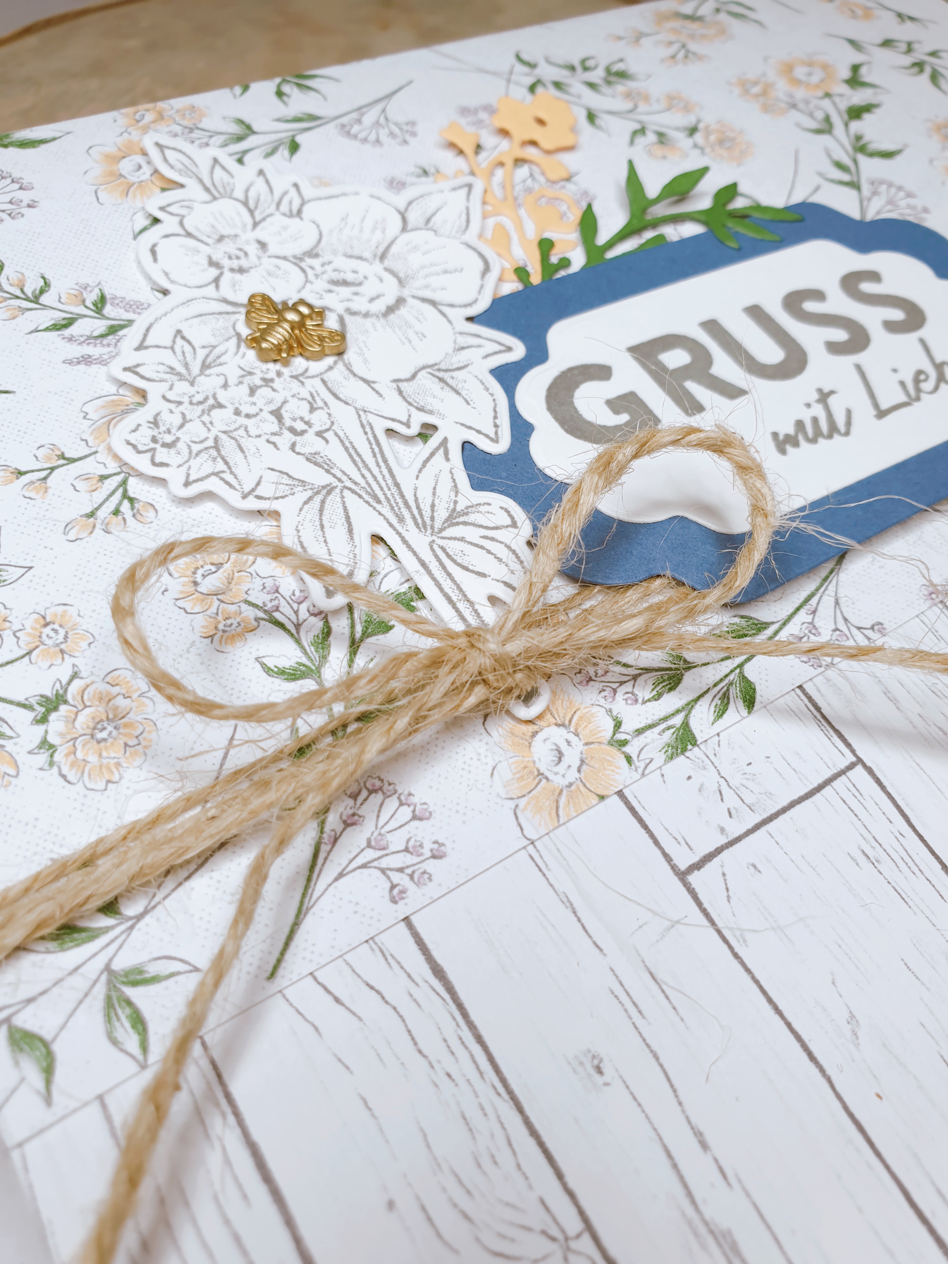 Für die gestempelte und ausgestanzte Blume und die kleineren Blumen- und Blattelemente habe ich das passende Stempelset LANDSEGEN und die Stanzform LANDBLÜTE verwendet. Der Text stammt aus dem Stempelset HÜBSCHE GRÜSSE, das aus dem Sale-a-Bration-Katalog stammt. Außerdem habe ich eine süße kleine goldene Biene verwendet, die du im Jahreskatalog unter METALL-ACCESSOIRES HUMMEL findest. Die Jutekordel ist aus meinem eigenen Vorrat.